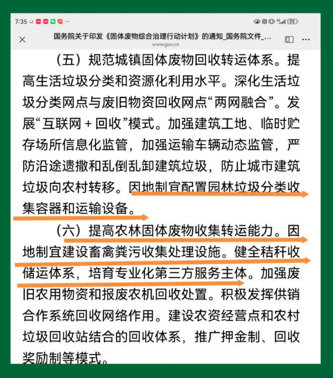 一、是用地保障政策。《行动计划》明确要求,各地要加强资源循环利用项目用地保障,安排不少于1%的产业用地用于支持资源循环利用设施建设,将生活垃圾分类收集、中转贮存等项目纳入公共基础设施用地保障范围。这一政策将有效解决农林废弃物收储点用地难题。