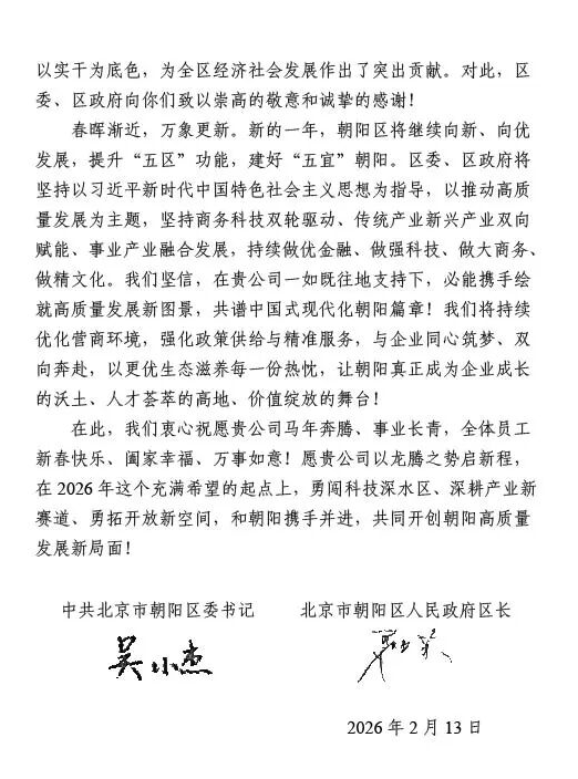 岁序更替,华章日新。在丙午马年新春的喜庆氛围里,动向国际科技股份有限公司收到了一份满载荣誉与温情的特殊礼物—来自中国共产党北京市朝阳区委员会、北京市朝阳区人民政府的春节感谢信。