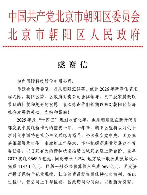岁序更替,华章日新。在丙午马年新春的喜庆氛围里,动向国际科技股份有限公司收到了一份满载荣誉与温情的特殊礼物—来自中国共产党北京市朝阳区委员会、北京市朝阳区人民政府的春节感谢信。